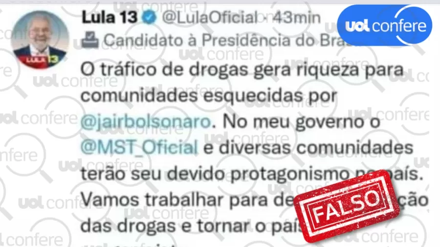 UOL Confere: É falso tuíte em que Lula diz que tráfico gera riqueza