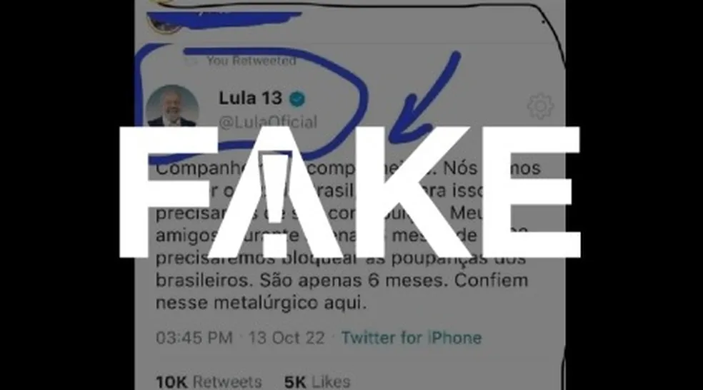Fato ou Fake: É #FAKE que Lula disse no Twitter que vai bloquear poupanças em 2023 para manter Auxílio Brasil