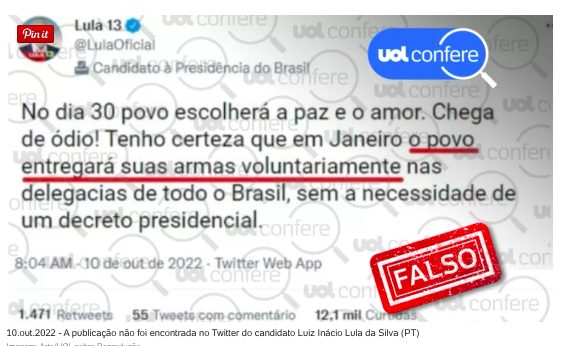 UOL Confere: É falso tuíte em que Lula diz que ‘população vai entregar armas’ em 2023