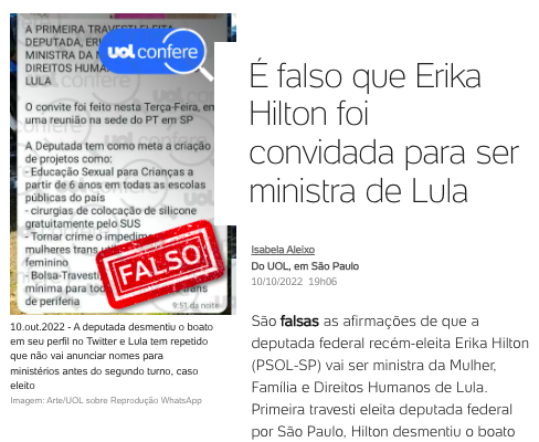 UOL Confere: É falso que Erika Hilton foi convidada para ser ministra de Lula
