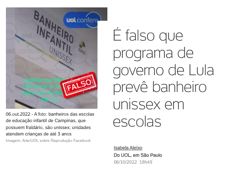 UOL Confere: É falso que programa de governo de Lula prevê banheiro unissex em escola