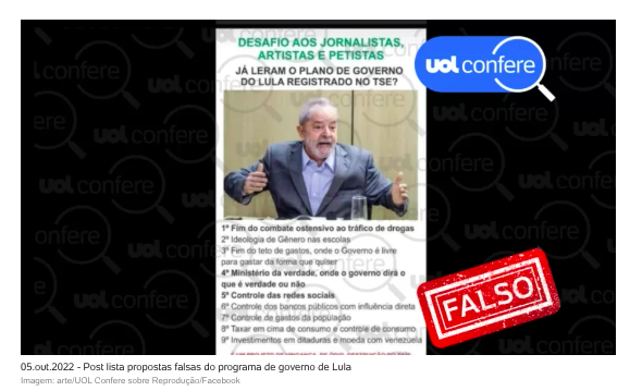 UOL Confere: Lista falsa de propostas do programa de governo de Lula circula nas redes