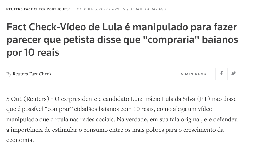 Reuters Fact Check: Vídeo de Lula é manipulado para fazer parecer que petista disse que “compraria” baianos por 10 reais