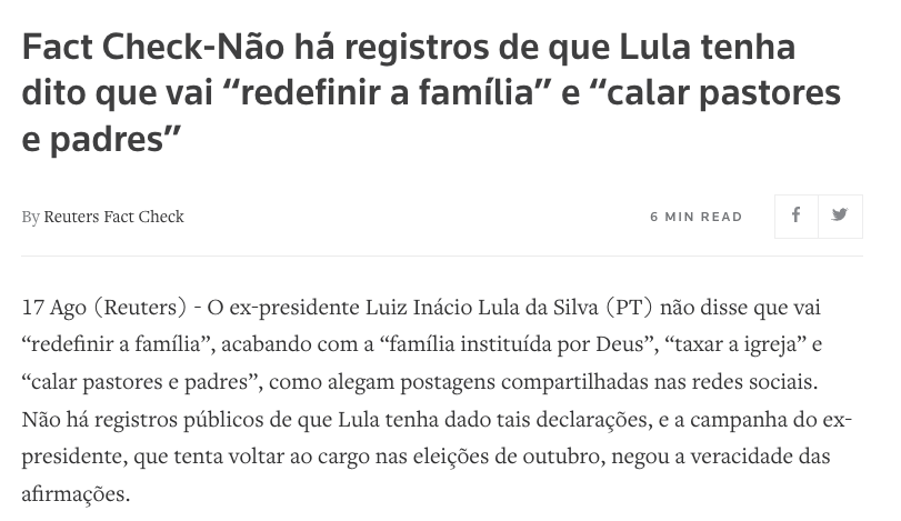 Reuters Fact Check: Não há registros de que Lula tenha dito que vai “redefinir a família” e “calar pastores e padres”