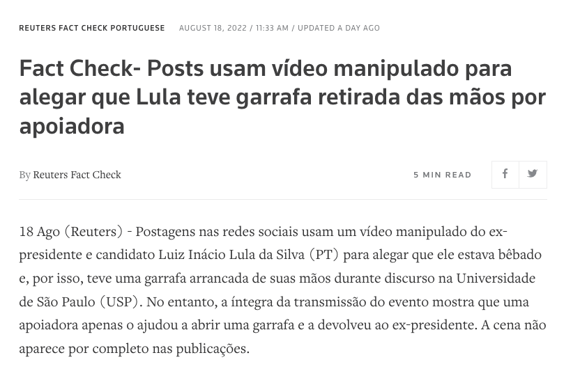 Reuters Fact Check: Posts usam vídeo manipulado para alegar que Lula teve garrafa retirada das mãos por apoiadora