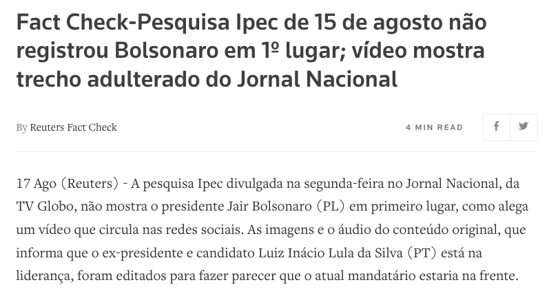 Reuters Fact Check: Pesquisa Ipec de 15 de agosto não registrou Bolsonaro em 1º lugar; vídeo mostra trecho adulterado do Jornal Nacional