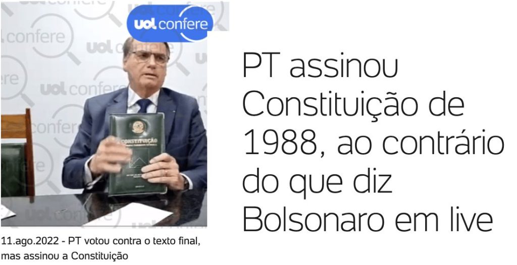 UOL Confere: PT assinou Constituição de 1988, ao contrário do que diz Bolsonaro em live