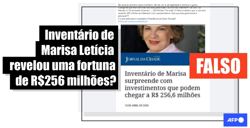 AFP Checamos: Não é verdade que inventário de Marisa, que foi mulher de Lula, revelou fortuna de R$ 256 milhões