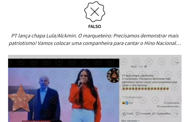 Agência Lupa: #Verificamos: É falso que Teresa Cristina errou hino nacional no lançamento da chapa de Lula e Alckmin