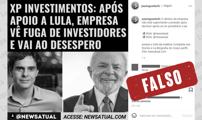 Agência Lupa: #Verificamos: É falso que XP Investimentos declarou apoio à candidatura de Lula