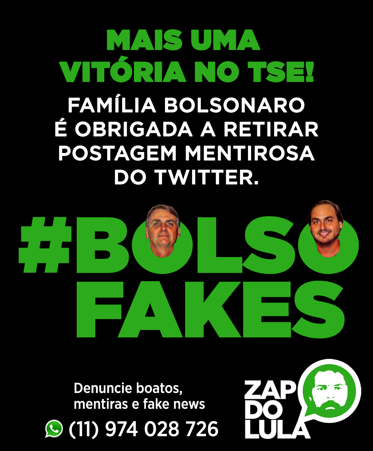 A defesa da Coligação “O Povo Feliz de Novo” conseguiu mais uma grande vitória contra boatos, mentiras e notícias falsas junto à Justiça Eleitoral. O TSE determinou, na noite desta quinta-feira (11/10), a retirada de mais uma notícia falsa que Carlos Bolsonaro e o PSL do Rio de Janeiro veiculavam pela internet contra a campanha de Haddad e Manuela.
