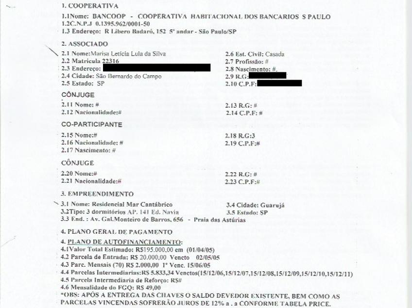 Marisa Letícia Lula da Silva assina o “Termo de Adesão e Compromisso de Participação” com a Bancoop – Habitacional dos Bancários de São Paulo.